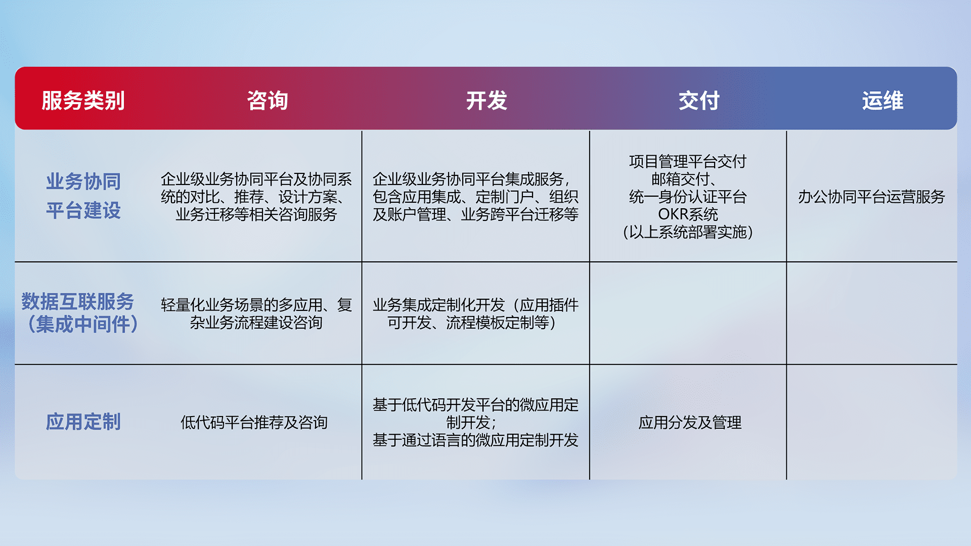 针对钉钉、、、企微、、、、IDaas等平台级产品提供产品的规划、、、方案、、、交付、、、定制化开发等服务,,实现如统一协同办公、、、、智能客户服务、、、混合会议管理、、、、智能数据查询、、、、等业务场景,,实现数字化转型。。