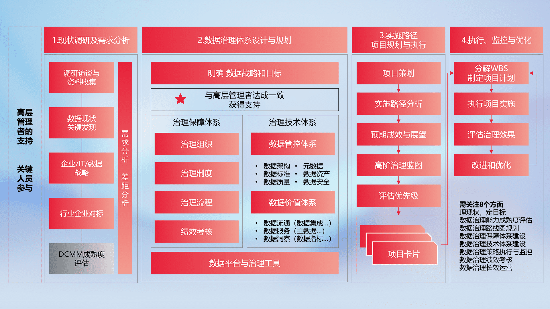 制定并执行统一的数据标准,,,规范数据定义和格式,,,,消除冗余和不一致性,,,,实现跨部门和跨系统的数据一致性,,,为企业提供标准化的数据基础。。。。